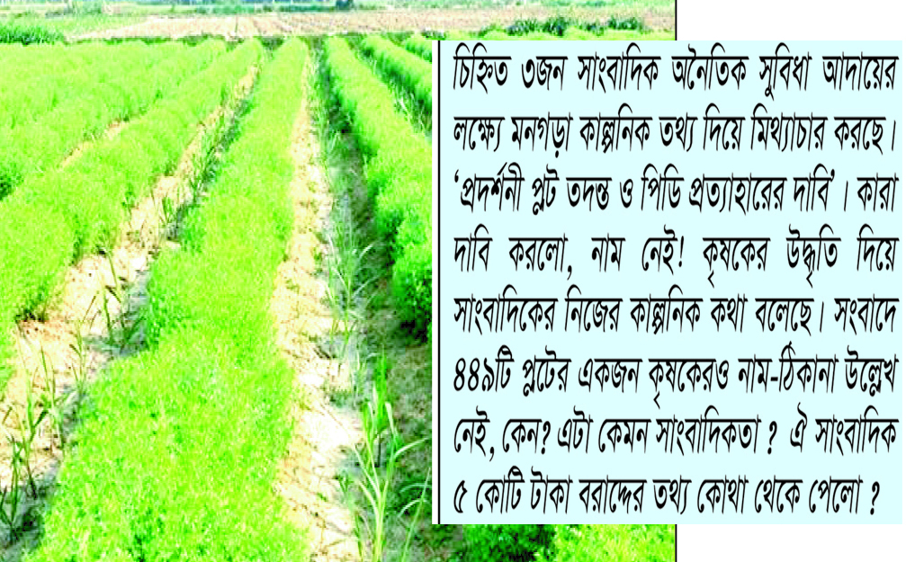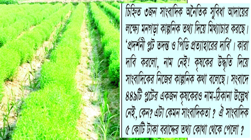 প্রকল্প পরিচালক ড. মো. আবু তাহের সোহেলের কাছে প্রকল্পের বিভিন্ন বিষয় জানতে চাইলে তিনি আক্ষেপ করে বলেন, বারবার সঠিক তথ্য আপনাদেরকে সরবরাহ করছি অথচ এই প্রকল্প নিয়ে আপনাদের গোত্রেরই চিহ্নিত ৩জন সাংবাদিক অনৈতিক সুবিধা আদায়ের লক্ষ্যে মনগড়া কাল্পনিক তথ্য দিয়ে মিথ্যাচার করছে। পুরো সংবাদ জুড়েই তাদের মিথ্যাচার আর মুর্খতার ষ্পষ্টতা দেখা যায়। তাদের সংবাদের ভাষ্য- ‘প্রদর্শনী প্লট তদন্ত ও পিডি প্রত্যাহারের দাবি’। কারা দাবি করলো, নাম নেই! দাবি কি তার নিজের ? কৃষকের উদ্ধৃতি দিয়ে সাংবাদিকের নিজের কাল্পনিক কথা বলেছে। সংবাদে ৪৪৯টি প্লটের একজন কৃষকেরও নাম-ঠিকানা উল্লেখ নেই, কেন? এটা কেমন সাংবাদিকতা ? ঘরে বসেই রিপোর্ট ? আমার সাথে কোনো কালেই জনৈক সাংবাদিকের কোনো প্রকার কথা হয়নি। অথচ আমার বক্তব্য ছেপেছে! ঐ সাংবাদিক কি প্রমান করতে পারবে আমার সাথে ফোনে বা সাক্ষাতে কখনো ১ সেকেন্ডের জন্যও কথা হয়েছে ? ঐ সাংবাদিক ৫ কোটি টাকা বরাদ্দের তথ্য কোথা থেকে পেলো ? এতেই তো প্রমানিত হয় কাল্পনিকতার রং কিভাবে লাগিয়েছে। সাংবাদিক হলেই যে কাউকে জিম্মি করে ফেলবেন এমন ধারনা ঠিক নয়। মিথ্যাচারিতা করলেও সাংবাদিকের কোনো জবাবদিহিতা নেই এমনটি ভাববেন না। ঐ সাংবাদিকদের নাম বলতে চাচ্ছিনা তবে আইনের আশ্রয় নিতে আমাকে বাধ্য করা হচ্ছে এতটুকু বলতে পারি।