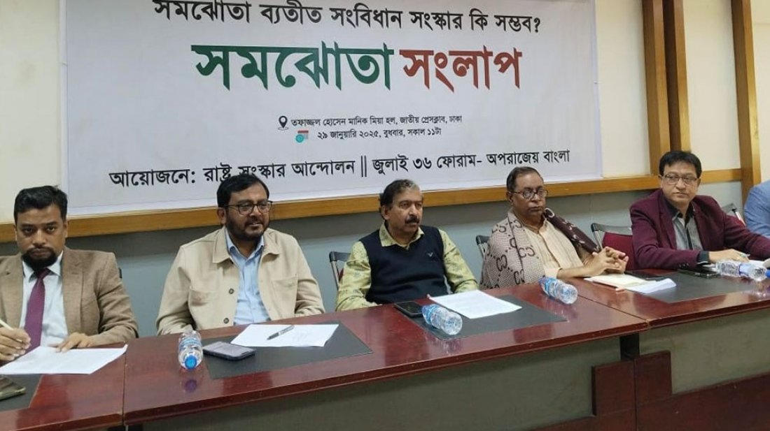 বুধবার (২৯ জানুয়ারি) জাতীয় প্রেস ক্লাবের তফাজ্জল হোসেন মানিক মিয়া হলে রাষ্ট্র সংস্কার আন্দোলন ও জুলাই ৩৬ ফোরাম ‘অপরাজেয় বাংলা’ আয়োজিত ‘সমঝোতা ব্যতীত সংবিধান সংস্কার কি সম্ভব?’ শীর্ষক সমঝোতা সংলাপে এ আহ্বান জানিয়েছেন তারা।